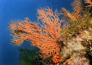 Archivo - La gorgonia 'Leptogorgia sarmentosa', característica de los fondos rocosos de Málaga y Cádiz, rodeada de frondes del alga exótica 'Rugulopteryx okamurae'. - IEO - Archivo