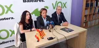 Los candidatos de Vox al Senado por Mallorca, Antonio Salvá y Manuela Cañadas, junto al presidente de Vox Baleares, Jorge Campos, en rueda de prensa - VOX BALEARES - Archivo