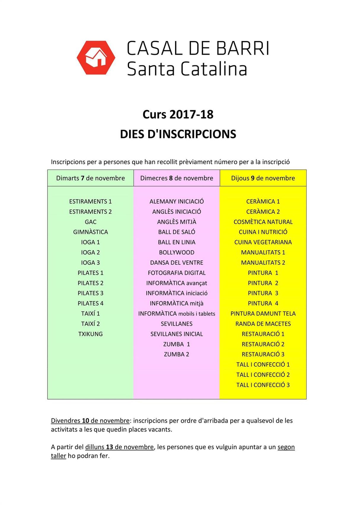 En cuanto al calendario del casal, el día 6 permanecerá abierto para facilitar la información al público en general y este martes 7 de noviembre a partir de las 9.00 horas los interesados podrán coger números para formalizar las inscripciones.