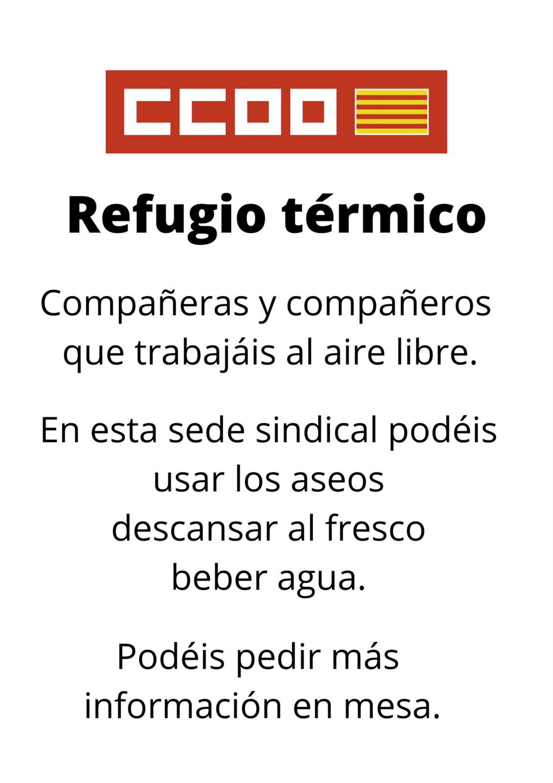 En una nota de prensa, CCOO Baleares ha informado que, a partir del próximo lunes, 17 de julio, abrirá sus sedes en Palma, Ibiza y Mahón para que todos aquellos trabajadores que realizan su trabajo en la calle --limpieza viaria, control de aparcamientos, riders, etcétera-- puedan disponer de un lugar de descanso, agua fresca y cuarto de baño.