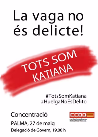 CCOO Baleares ha iniciado este jueves una campaña de apoyo a su secretaria general, Katiana Vicens, a quien se le pide cuatro años y medio de prisión por unos hechos ocurridos durante la huelga general del 29 de marzo del 2012, cuya primera acción de defensa será una concentración ante Delegación de Gobierno el próximo 27 de mayo, a la que ya ha confirmado asistencia el secretario general de CCOO, Ignacio Fernández Toxo.