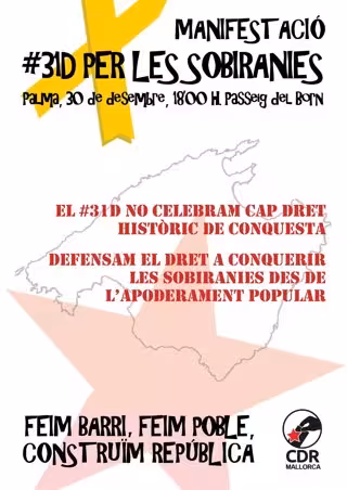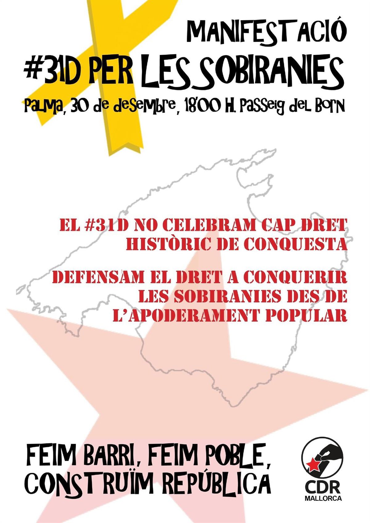 Los Comités de Defensa de la República (CDR) de Mallorca --Canamunt, Bons Aires, Pere Garau, Santa Catalina, UIB, Manacor, Sineu, Puigpunyent, Alaró, Santa Maria, Inca, Llubí y Campanet-- han hecho un llamamiento a participar en la manifestación convocada para el día 30 de diciembre en Palma a las 18.00 horas con motivo de la Diada de Mallorca.