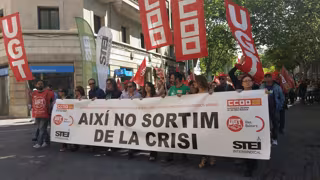 La concentración unitaria de los sindicatos Comisiones Obreras (CCOO), la Unión General de Trabajadores (UGT) y el Sindicato de Trabajadores Intersindical (STEI) ha marchado por la calle Olmos hacia las Ramblas bajo el lema 'Así no salimos de la crisis'.