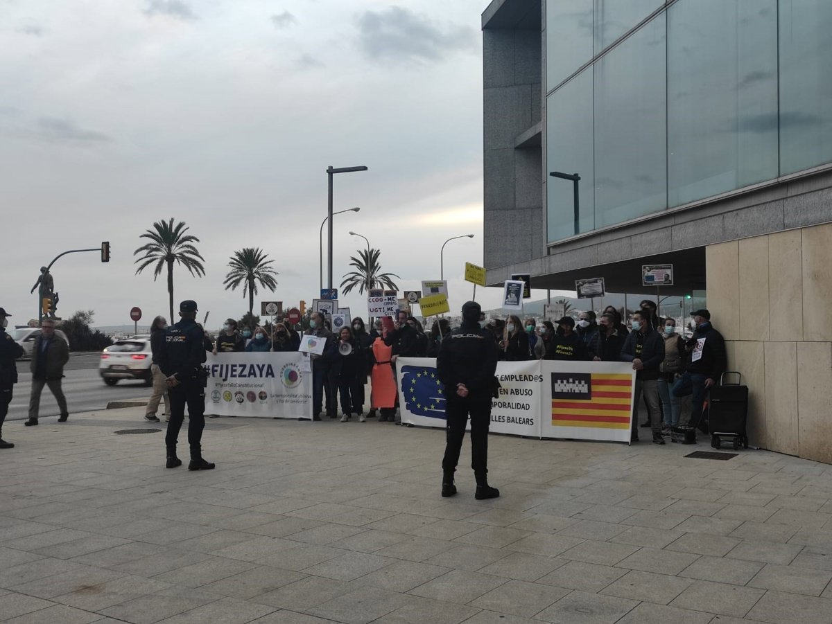 Alrededor de 50 personas, trabajadores interinos de la administración pública, se han concentrado este viernes frente al Palacio de Congresos de Palma para protestar contra la temporalidad y a la espera de la llegada de la ministra de Trabajo y Economía Social, Yolanda Díaz, que se encuentra en la capital balear para asistir al V Foro El Económico 'La fuerza del diálogo'.