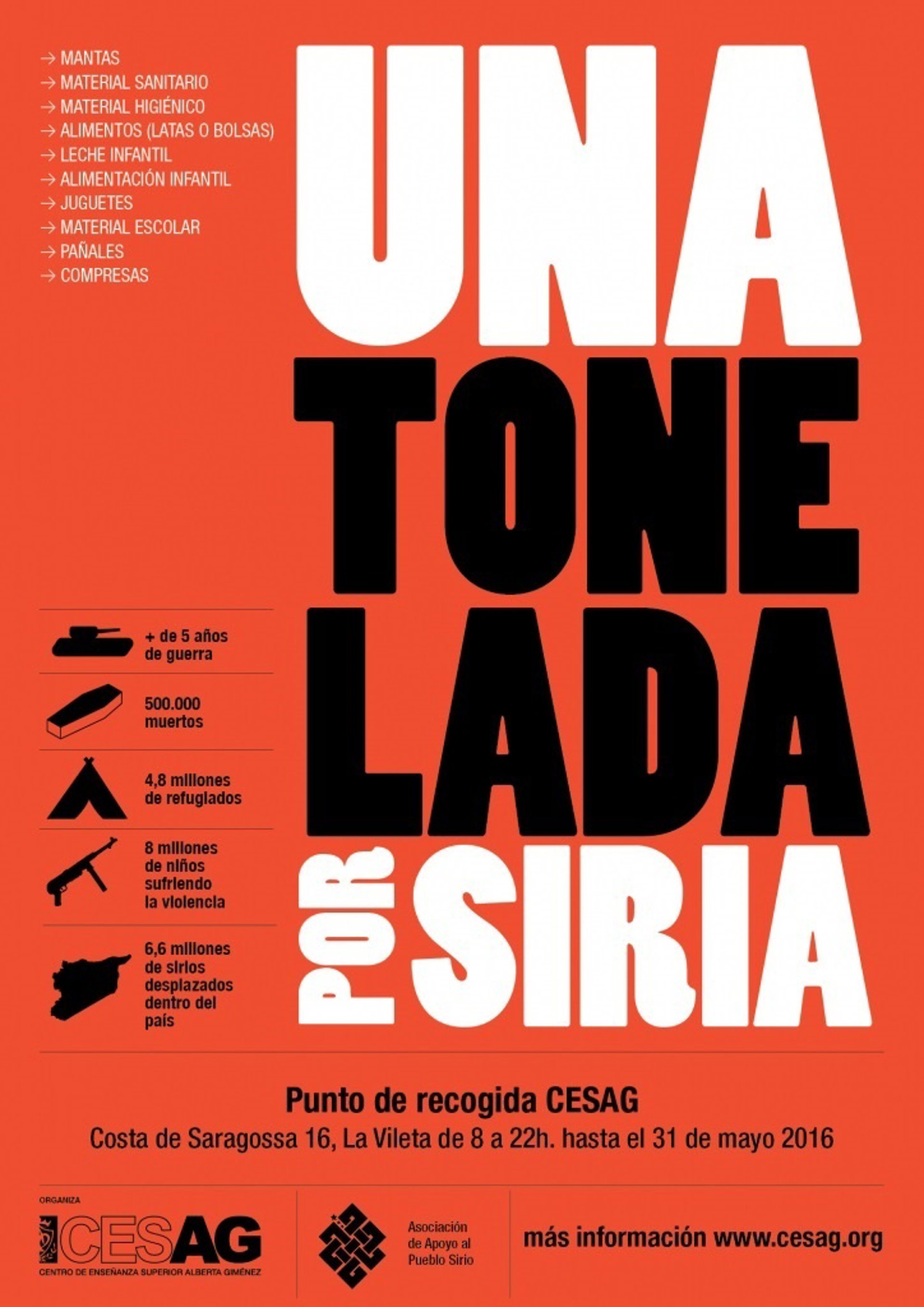 Profesores y alumnos participan en la iniciativa, bautizada 'Una tonelada por Siria', con la que se pretende reunir este peso en alimentos (en latas o bolsas: arroz, legumbres, pasta), productos sanitarios e higiénicos (vendas, esparadrapo, guantes, alcohol, jabón, compresas), material infantil (leche para bebés, pañales), mantas, sacos de dormir, juguetes y material escolar. No se recogen medicamentos ni ropa.