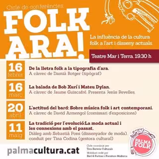 'El cicle de converses Folk ara!' comenzará este jueves, a las 19:30 horas, con la charla del tipógrafo Damià Rotger titulada 'De la letra folk a la tipografía de ahora', organizado por el Área de Cultura, Política Lingüística y Memoria Histórica con el que se pretende abordar "la influencia de la cultura folk al arte y diseños actuales".