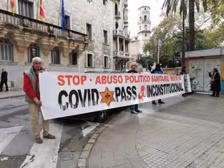Cinco personas han desplegado este martes por la mañana una pancarta contra el certificado COVID ante el Tribunal Superior de Justicia de Baleares (TSJIB), que en los próximos días tiene que pronunciarse sobre si autoriza la medida aprobada este lunes por el Govern balear.