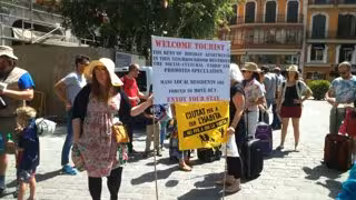 Los participantes en la protesta, que iban ataviados como turistas -maleta en mano y gafas de sol-, han criticado la proliferación de pisos turísticos en la capital balear que está provocando el desplazamiento involuntario de los vecinos de sus barrios, debido al encarecimiento de la vivienda, y han denunciado la saturación de los servicios públicos como consecuencia de la masificación turística.