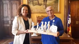 El presidente del Grup Güell, Francisco Bauz, organizador de la marcha 'des Güell a Lluc a Peu', ha entregado este jueves a la presidenta del Consell de Mallorca, Catalina Cladera, un 'siurell' especial "con gente que camina" fabricado con motivo de la celebración del 50 aniversario de la organización.