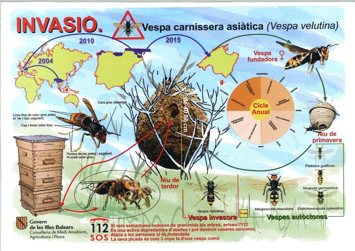 Cabe recordar que hace pocas semanas la Universitat de les Illes Balears (UIB) confirmaba la alarma de un apicultor del Valle de Sóller, sobre la presencia de la especie invasora Vespa velutina, un himenóptero de origen asiático que se ha expandido por Europa Occidental y ocasiona un impacto importante sobre las colmenas de abejas porque en su fase reproductora ese una depredadora muy activa, en especial de abejas.