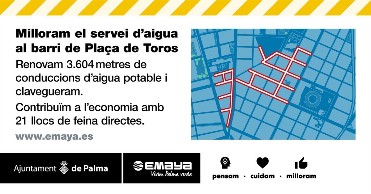 Este lunes comienzan las obras de renovación de la red de agua potable y de alcantarillado en el barrio de Plaza de Toros. El objetivo del Ayuntamiento de Palma es renovar 2.822 metros de conducciones de agua potable y 782 m de alcantarillado.