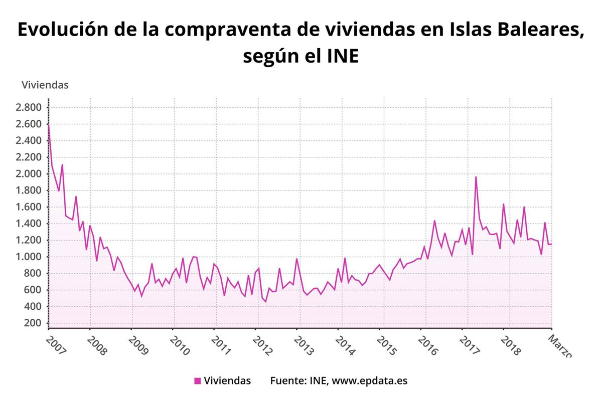 La compraventa de viviendas ha descendido en Baleares un seis por ciento en marzo, respecto al mismo mes del año anterior, tras intercambiarse un total de 1.155 inmuebles, según los datos del Instituto Nacional de Estadística (INE), que precisa que a nivel nacional la compraventa de viviendas se incrementó un 6,8 por ciento en relación al mismo mes de 2018, hasta sumar 42.649 operaciones.