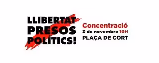 La Coordinadora d'Entitats per la Democràcia ha convocado este viernes a las 19.00 horas una concentración en la Plaza de Cort a favor de la libertad de "los presos políticos", después de que la jueza Carmen Lamela haya solicitado prisión para el ex vicepresidente de la Generalitat, Oriol Junqueras, y otros siete ex consellers, por delito de rebelión.
