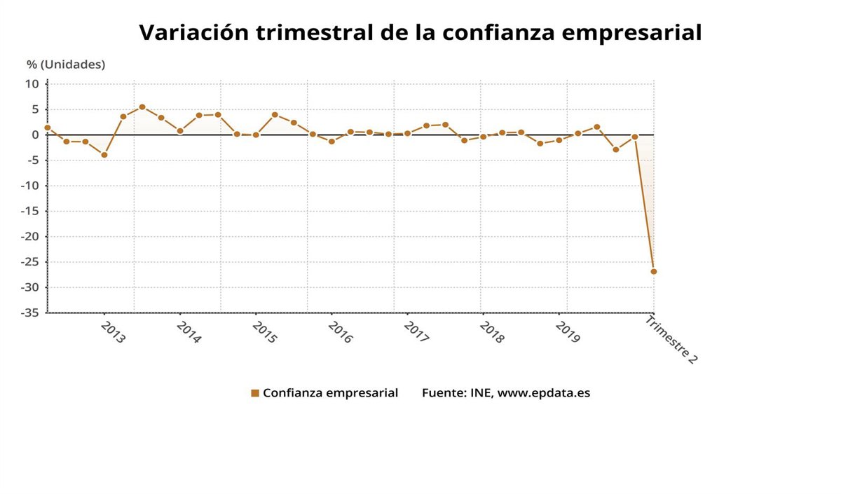 En el conjunto de España, el índice de confianza empresarial ha descendido un 26,9% en el segundo trimestre de 2020 respecto al primero. El 3,1% de los establecimientos prevé un trimestre favorable y el 75,1% son pesimistas sobre la marcha de su negocio.
