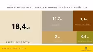 El Departamento de Cultura, Patrimonio y Política Lingüística del Consell destinará 18,4 millones de euros a cultura, protección del patrimonio y al fomento del catalán en los Presupuestos de 2021, lo que supone un incremento del 10% respecto a este año y permitirá mantener las partidas para crear y programar eventos culturales, proteger el patrimonio y el fomento del uso del catalán, a través de ayuntamientos, entidades, empresas o particulares.