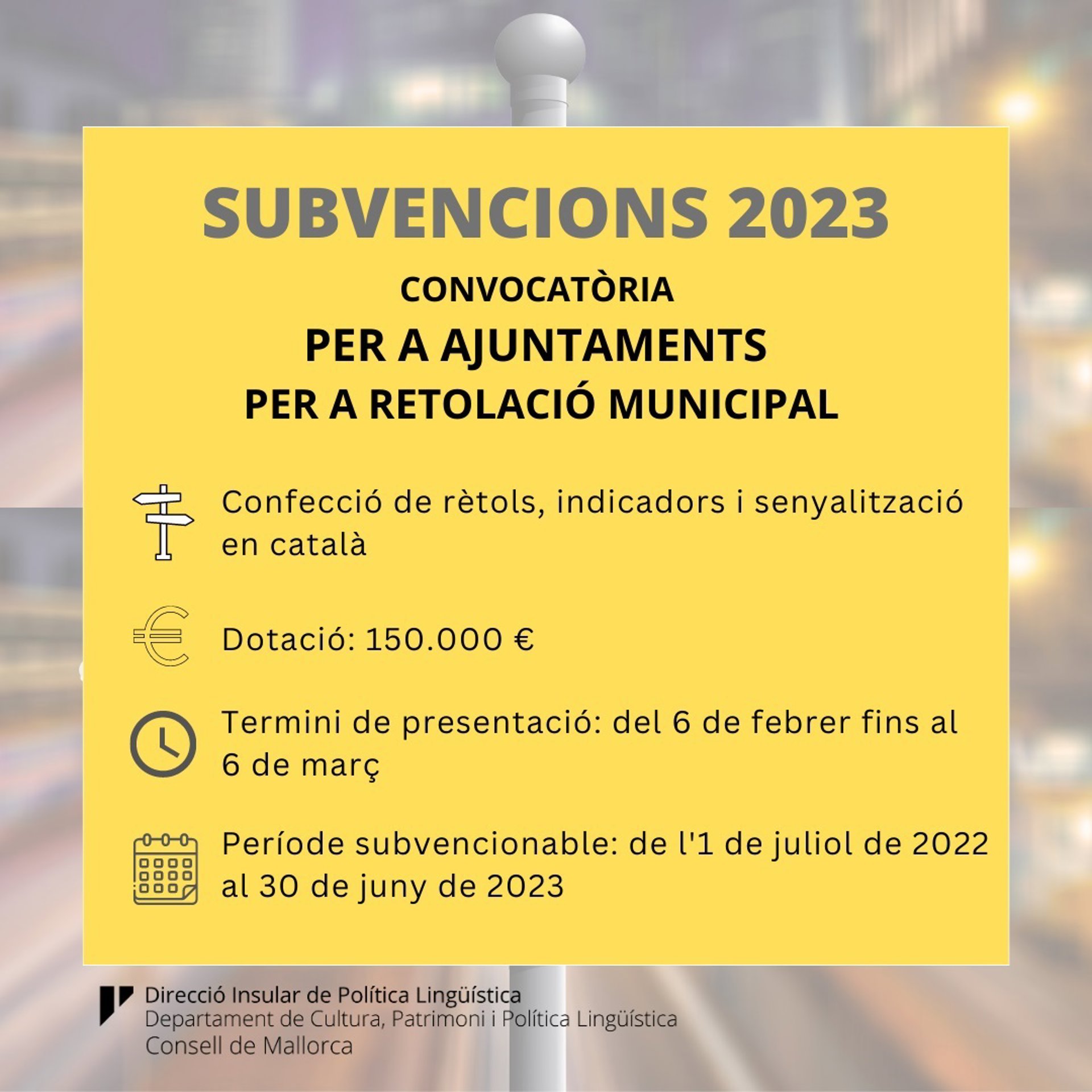 El Consell de Mallorca, a través de la Dirección Insular de Política Lingüística, ha publicado una convocatoria de subvenciones por valor de 150.000 euros dirigidos a los ayuntamientos de la isla para la confección de rótulos, indicadores y señalizaciones en catalán.