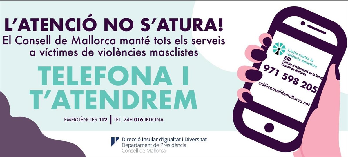 El Consell de Mallorca, a través de la Dirección Insular de Igualdad y Diversidad, ha iniciado este viernes la campaña 'La atención no se detiene. Llama y te atenderemos', de difusión del teléfono de atención a las víctimas de violencia machista.