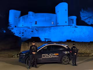 Agentes de la Policía Nacional, junto a un vehículo policial, y, tras ellos, el Castillo de Bellver, teñido de azul por el Bicentenario del Cuerpo - POLICÍA NACIONAL