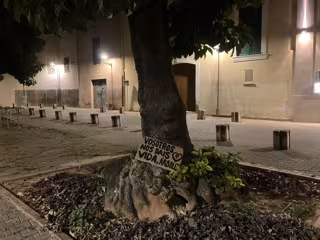 Cartel colocado por los vecinos en uno de los ejemplares de bellasombras de la plaza Llorenç Villalonga de Palma. - EUROPA PRESS