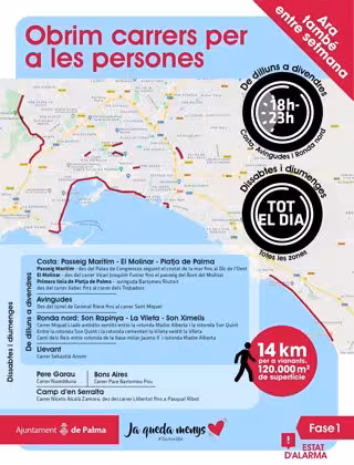 Según ha informado Cort este domingo en una nota de prensa, el fin de la ampliación del horario de apertura de calles para peatones es el fomento del uso de estos espacios entre las familia y los menores de 14 años de edad, dado que el horario para la salida de menores permitido es hasta las 19.00 horas.