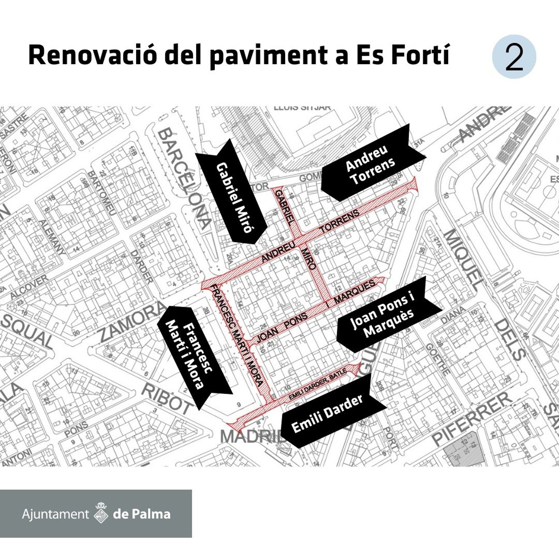 El Ayuntamiento de Palma comenzará este lunes, 30 de mayo, la renovación del pavimento de siete calles en el barrio de Es Fortí, con una inversión de 105.181 euros.