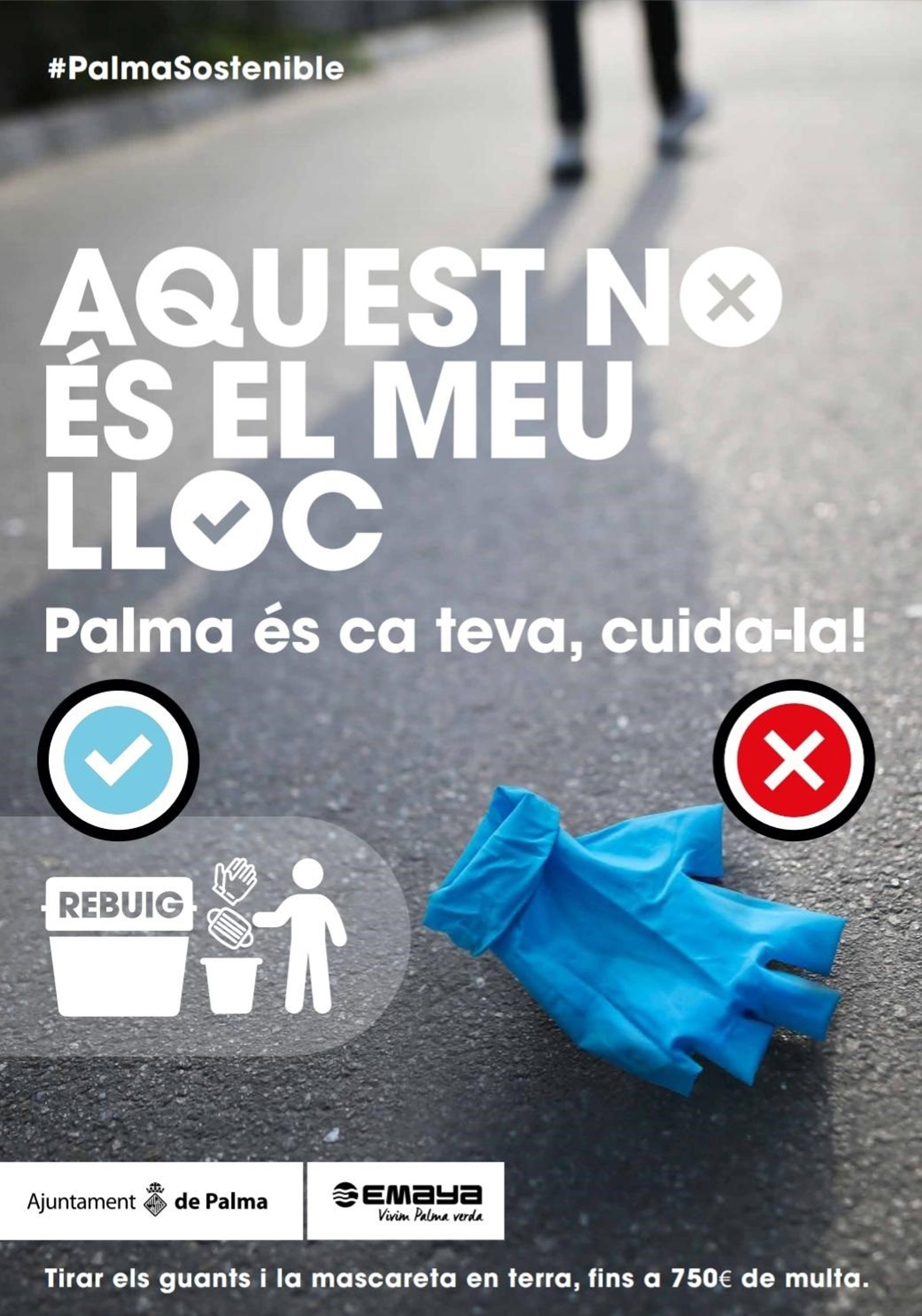 El Ayuntamiento de Palma y Emaya han iniciado una campaña para pedir a la ciudadanía colaboración para tener una ciudad más limpia y detener posibles focos de expansión de la COVID-19, evitando tirar guantes y mascarillas usados al suelo, en los parques o en espacios públicos.