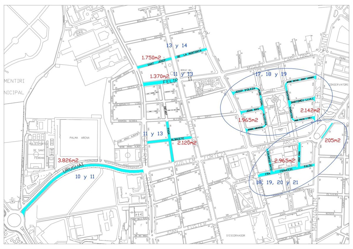 Posteriormente, los días 13 y 14 de este mismo mes de octubre se pavimentará, por tramos, la calle Sant Josep de la Muntanya; los días 17 y 18, las calles Bisbe Rafael Josep Verger, Gaspar Sabater, Joan Palou i Colll y Bartomeu Llull; los días 18 y 19, las calles Josep d'Oleza, Jaume Vidal Alcover, Joan Mas y Jeroni Amengual; y, por último, los días 19, 20 y 21 de octubre, las calles Fra Francesc Palou, Josep Pons y Eduardo Dato.