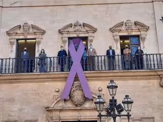 El Ayuntamiento de Palma luce en su balcón la lazada por el Día Internacional de la Eliminación de la Violencia contra la Mujer, que se celebra este miércoles.
