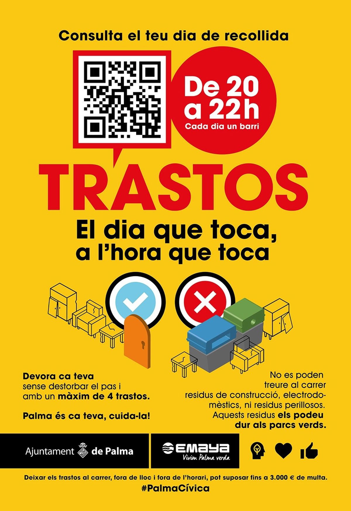 El objetivo de este nuevo servicio de recogida es que los ciudadanos de Palma cumplan con el día, la hora y el lugar de recogida, para así mantener las calles del municipio lo más limpias posible y contribuir a la gestión sostenible de los objetos voluminosos.