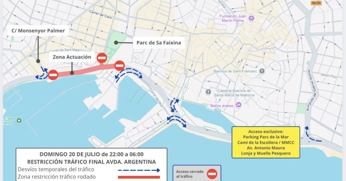 En la avenida Argentina, por su parte, se restringirá la circulación a la altura de la calle Sant Magí en sentido ascendente y se habilitarán rutas alternativas. En sentido descendente se permitirá únicamente el acceso a la calle Aníbal y el resto de vehículos deberán desviarse por el parque de Sa Feixina.