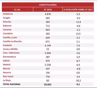 La constitución de empresas aumentó en el cuarto trimestre de 2018 en diez comunidades autónomas, especialmente en Cantabria (13,5%), Galicia (8,7%) y Cataluña (7,4%), se mantuvo en Navarra y descendió en seis regiones, fundamentalmente en La Rioja (-20,2%) y Asturias (-12,9%).