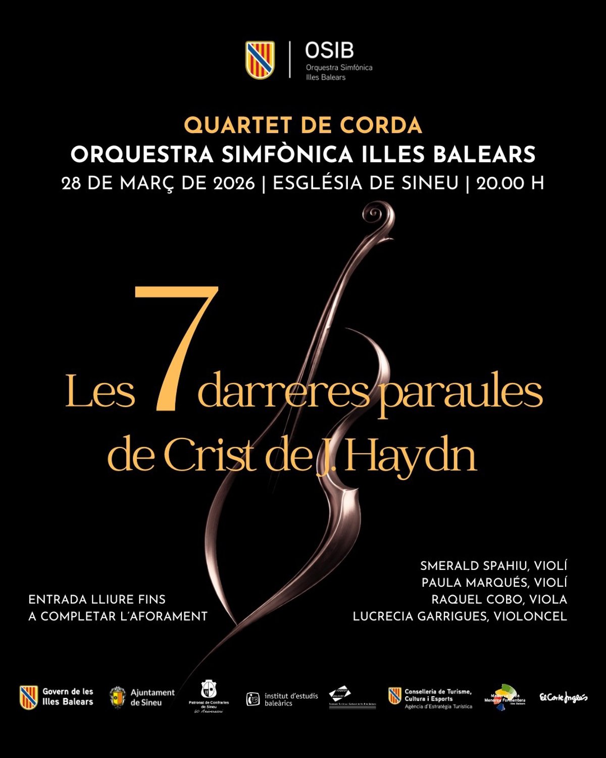 Un cuarteto de cuerda de la Orquesta Sinfónica de Baleares ofrecerá el próximo sábado, 28 de marzo, un concierto de cámara en la iglesia de Sineu, en el que interpretará 'Las siete últimas palabras de Cristo en la Cruz', del compositor Joseph Haydn.