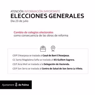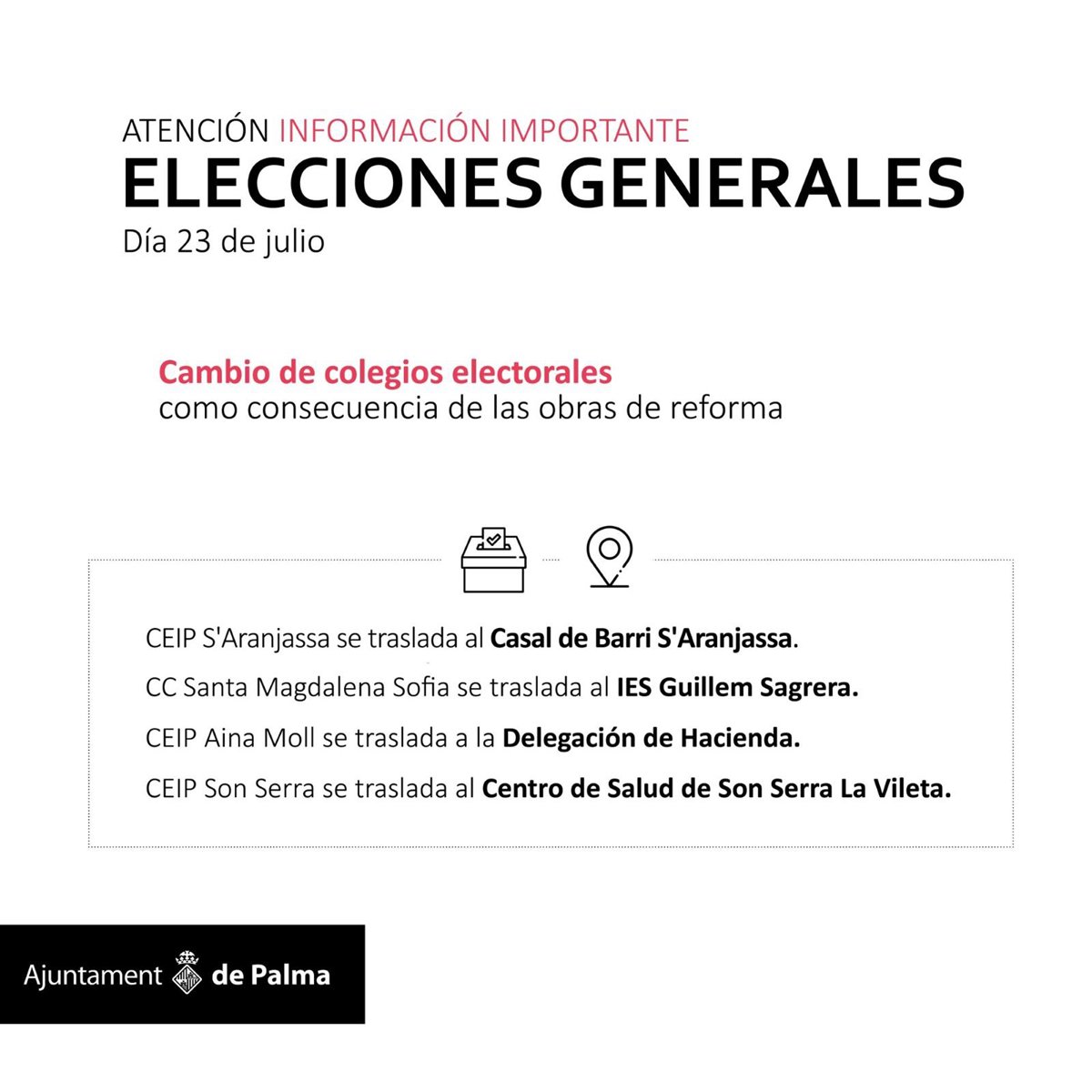 El Ayuntamiento de Palma ha informado este miércoles que, a consecuencia de las obras que se están ejecutando en tres colegios, las mesas electorales que estaban allí previstas se trasladarán a cuatro nuevos espacios para que los ciudadanos puedan votar.
