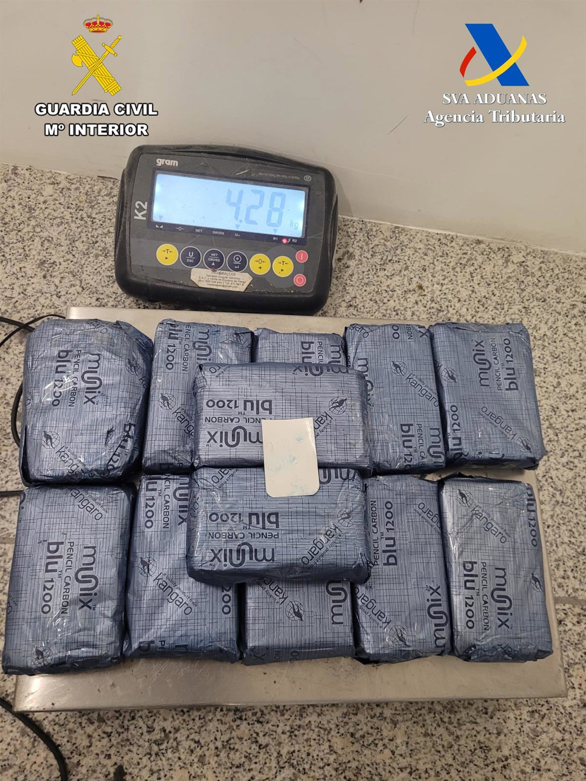 Según han informado en un comunicado, los hechos ocurrieron el pasado miércoles cuando agentes de la Unidad de Análisis e Investigación Fiscal y de Fronteras, tras realizar un examen radiológico de un equipaje procedente de un vuelo internacional, observaron varias formas y contrastes que podrían corresponderse con sustancias estupefacientes y que, una vez abierto el equipaje, se hallaron ocultos en un doble fondo una docena de paquetes de cocaína de un total de cuatro kilos.