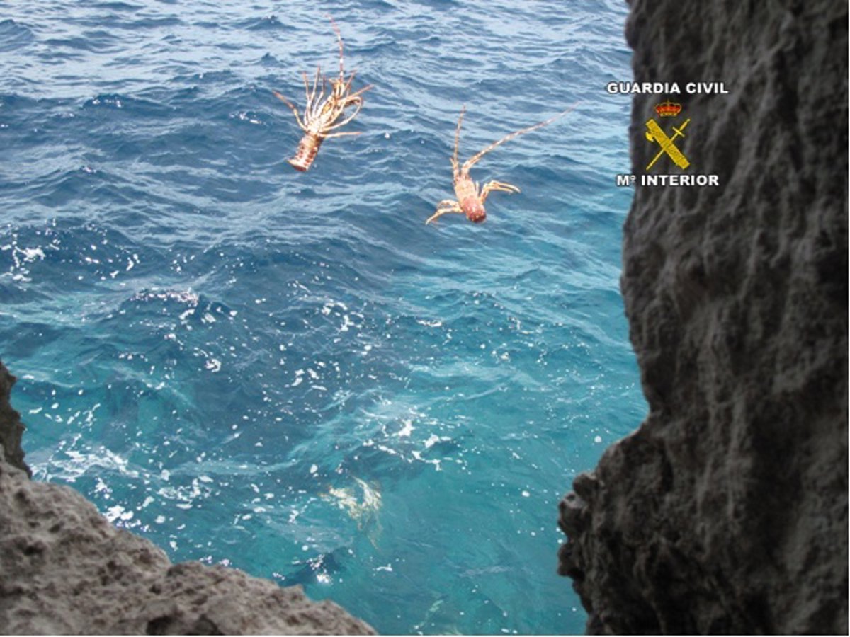 En el interior, se hallaron once langostas de las que sólo dos cumplían con la medida adecuada, siendo el resto de talla irregular, por lo que se procedió a su incautación y posterior puesta en libertad en el mar.