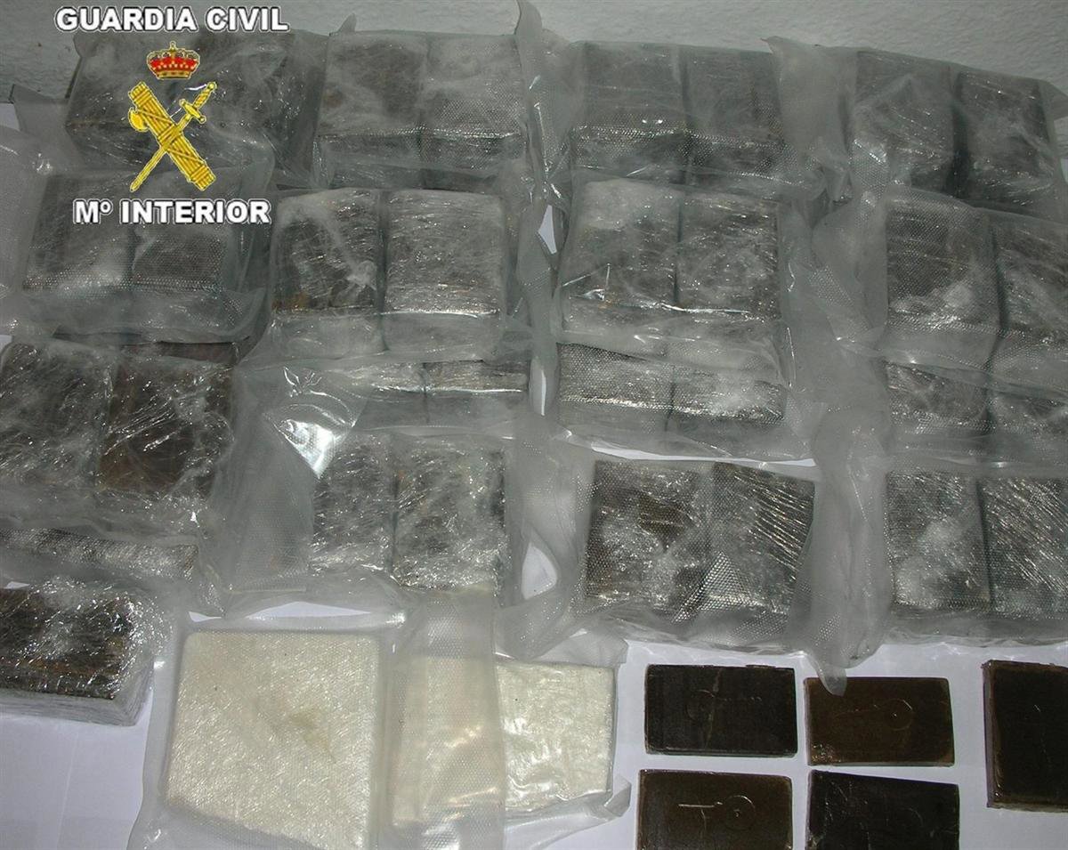 Para desincrustar la caja de la zona del motor, los agentes debieron retirar varias piezas y cortar incluso los conductos del aire acondicionado. En el interior había 21,100 kilos de hachís distribuido en 22 bolsas envasadas al vacío, cada una con 5 tabletas cubiertas con film transparente, y otras dos bolsas con 1,100 kg de cocaína. La droga había sido embadurnada en una sustancia con olor a mentol para camuflar los posibles olores que pudiera desprender.