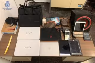 No obstante, los agentes realizaron diversas gestiones y pudieron averiguar que supuestamente dos de estas personas habían ocultado varios de los objetos sustraídos en diferentes lugares cercanos. En concreto, unos agentes localizaron en el interior de una papelera y un contenedor dos carteras propiedad del perjudicado, mientras que otros hallaron en el cuarto de contadores de un edificio próximo cinco ordenadores, tres tablets, un libro electrónico, dos altavoces, una bandolera y otra cartera, siendo la mayoría de efectos reconocidos por el perjudicado.