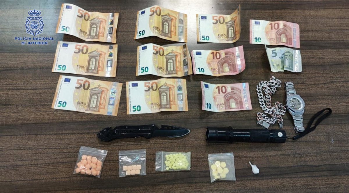 En el registro del vehículo se encontró una bolsa en cuyo interior había sustancias estupefacientes. Además, se localizó dinero en efectivo, una navaja y una linterna tipo "taser".
