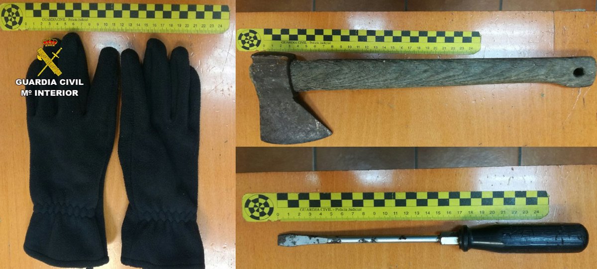 En el momento de su detención, los agentes le intervinieron un hacha, un destornillador, una linterna, una navaja y unos guantes.
