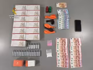 Al revisar el turismo, los agentes encontraron 13 cajas de 24 botellas de óxido nitroso; un dispensador para esta sustancia; una bolsita que contenía 12 gramos de cocaína, así como otra con unos gramos de una sustancia en polvo de color rosáceo pendiente de analizar, aunque posiblemente se trate también de cocaína.