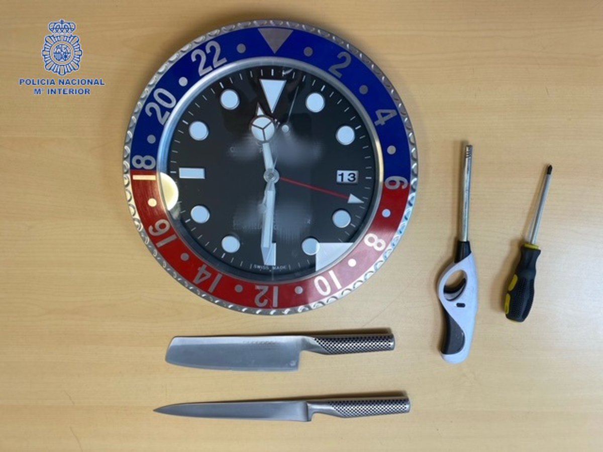 Entre las pertenencias del arrestado se encontraba una cartera con una tarjeta bancaria a nombre de una mujer y dinero, sin dar explicación coherente de su procedencia, así como un reloj de alta gama y dos cuchillos de cocina.