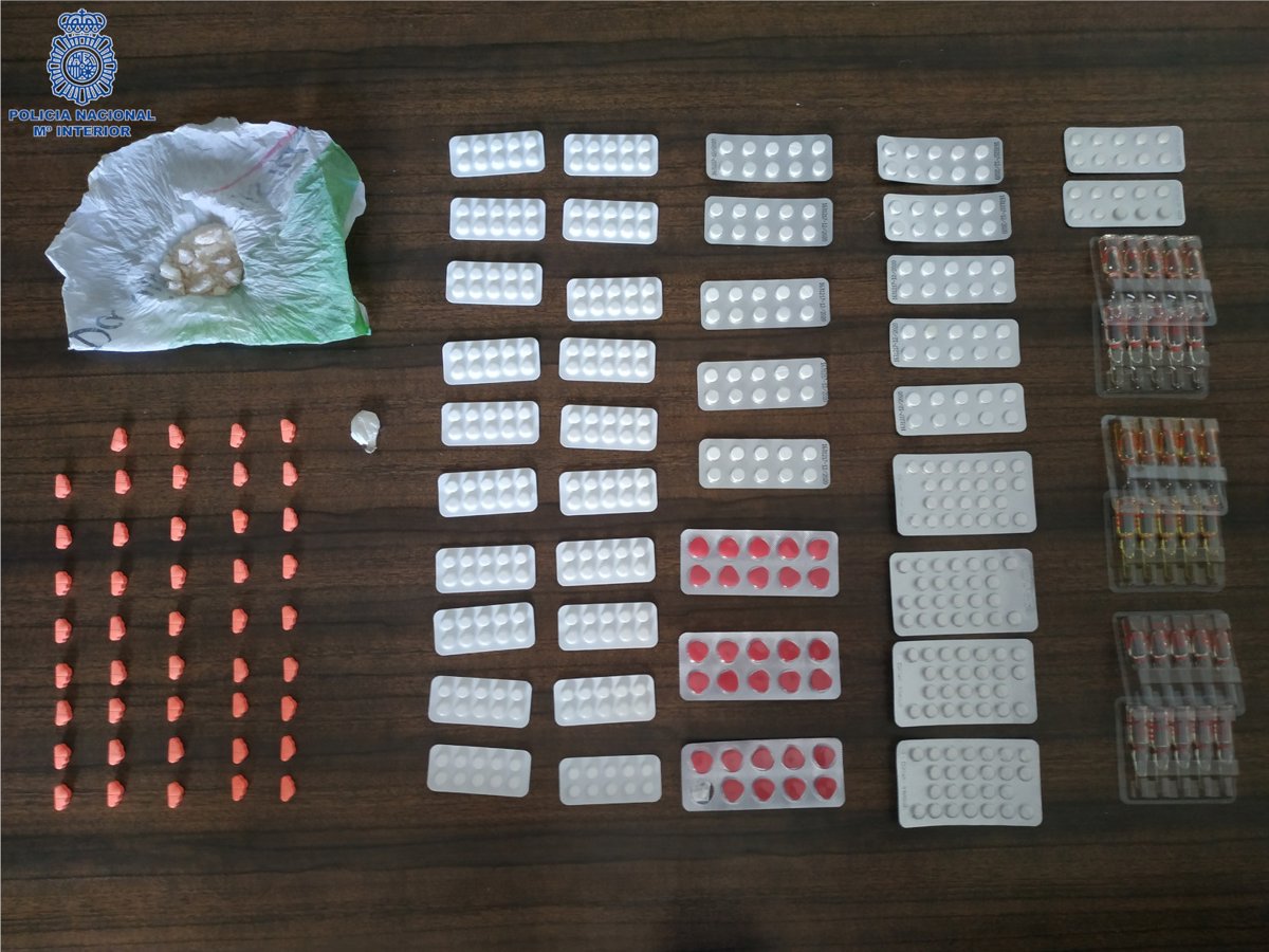Posteriormente, los agentes averiguaron que en el domicilio se encontraba una mochila que pertenecería al detenido, comprobando como en su interior se encontraban diversas sustancias al parecer una bolsa pequeña de MDMA, una papelina de cocaína y 44 comprimidos de Éxtasis, así como sustancias anabolizantes en blíster y ampollas.