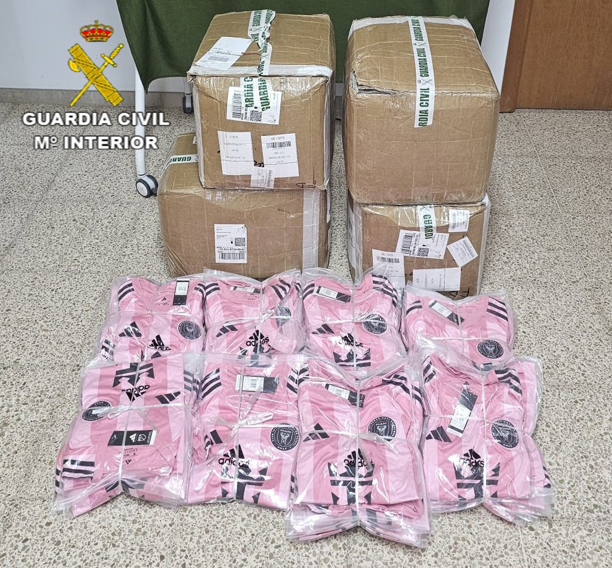 Imagen de las cuatro cajas intervenidas por la Guardia Civil en un control en el Arenal de Llucmajor, las cuales contenían camisetas falsificadas de un equipo de fútbol con el logotipo de una marca reconocida - GUARDIA CIVIL