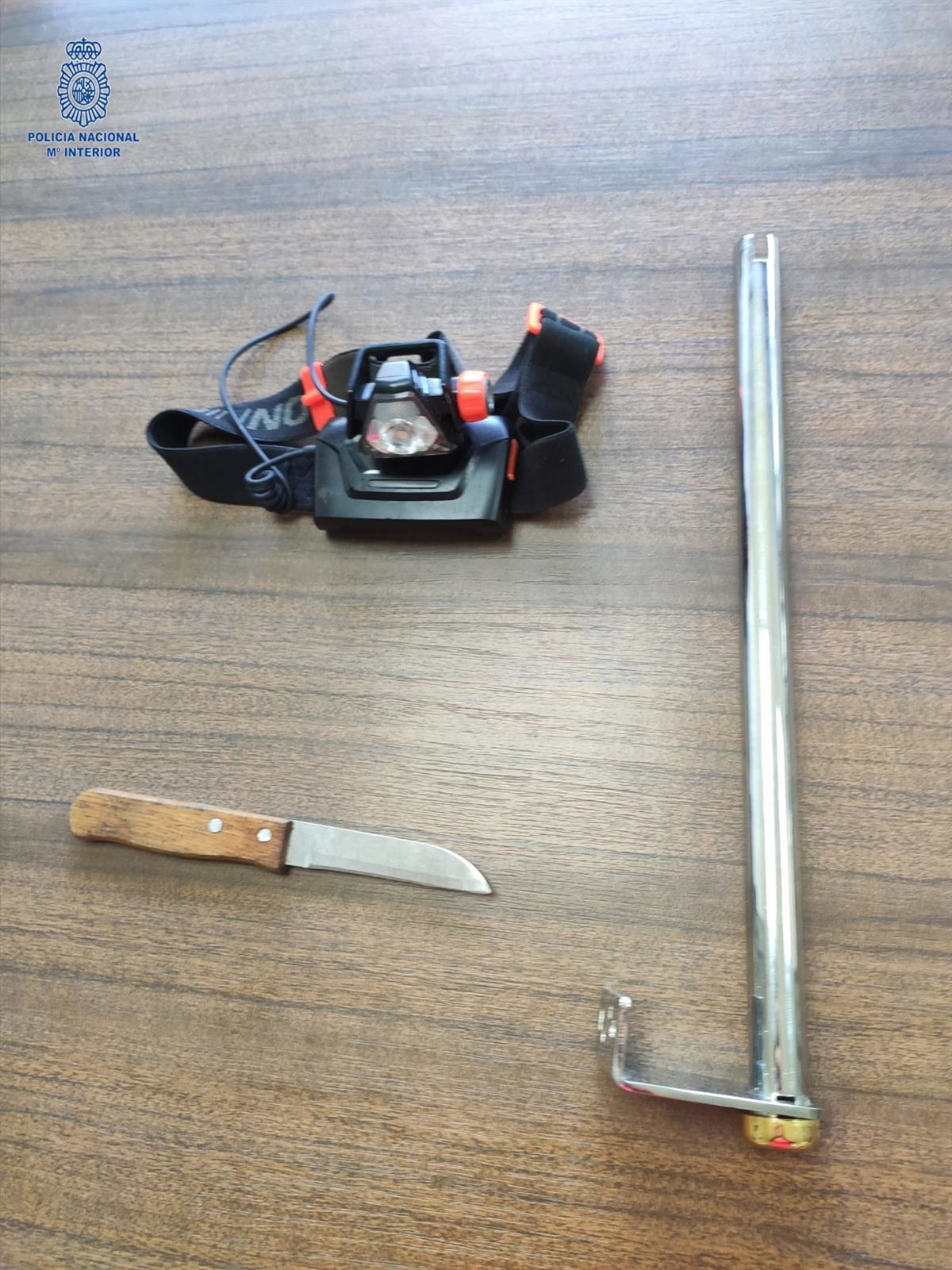 Los policías realizaron una requisa a fondo del lugar, por si pudiera haber alguien más, pero solo encontraron una bolsa con efectos del detenido en la cocina de la vivienda, interviniendo una linterna frontal, un cuchillo y una barra metálica.