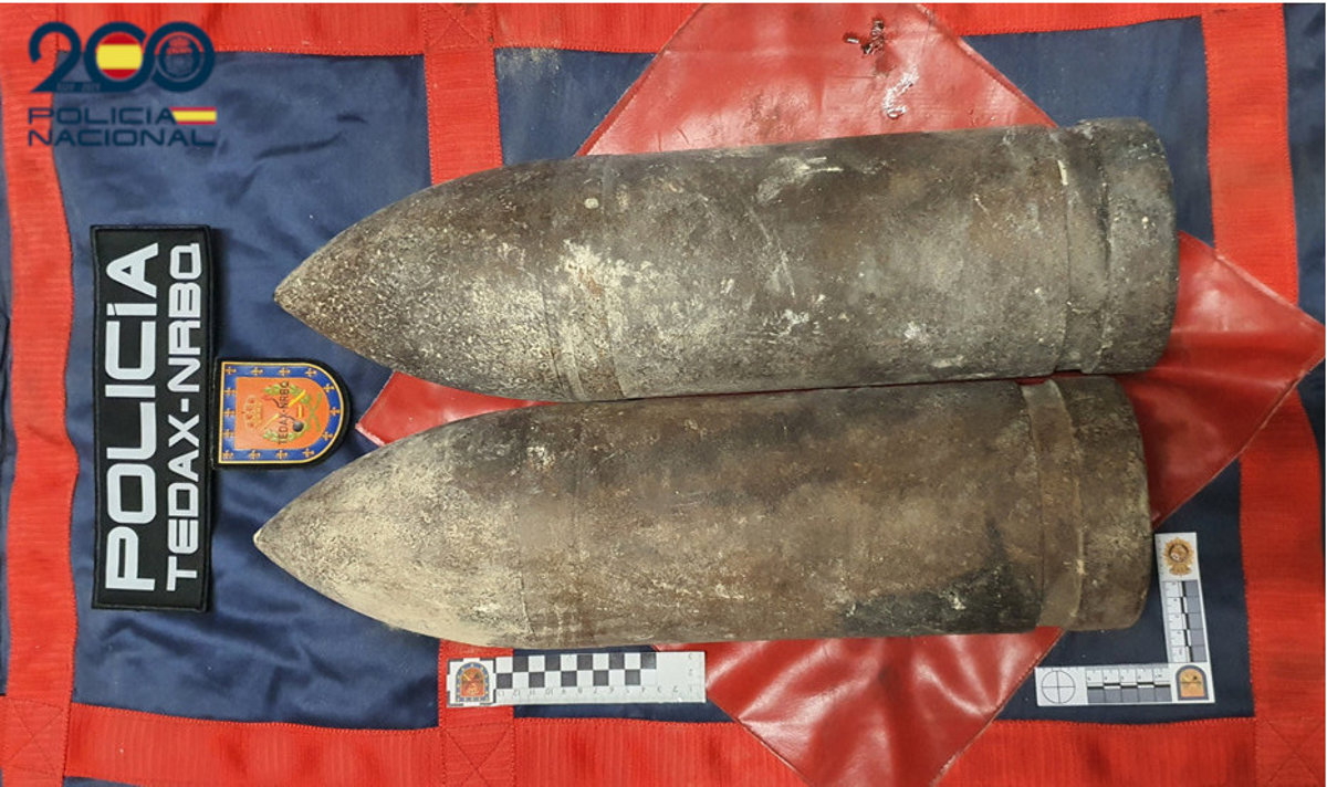Además, un equipo de Tedax de la Policía Nacional procedió al traslado y neutralización de dos proyectiles de artillería perforantes de 150 milímetros, fabricados en el año 1885 y con un peso de 50 kilos cada uno.
