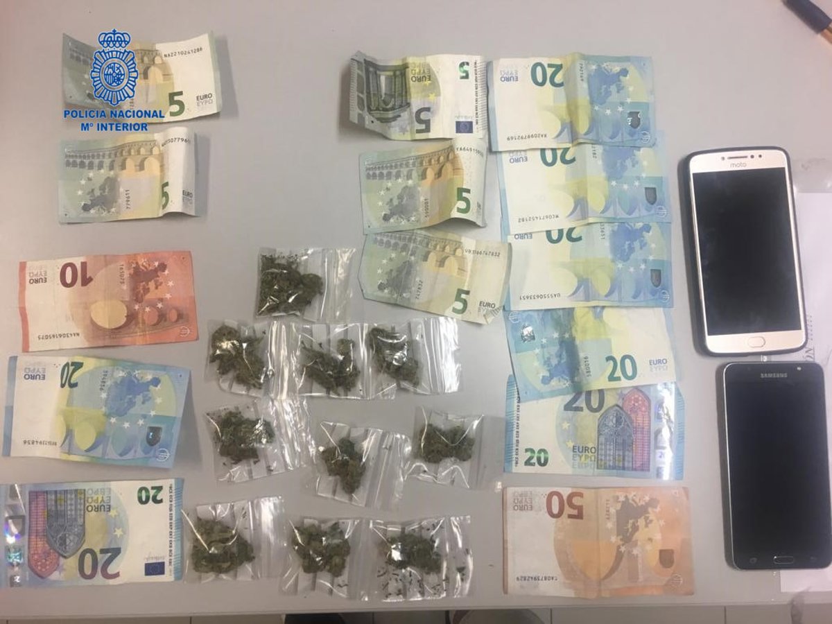 Al realizar un cacheo a los presuntos autores, se le localizó a uno de ellos diez bolsas pequeñas de marihuana y al otro dinero en efectivo, por lo que los mismos fueron detenidos por un presunto delito contra la salud pública.
