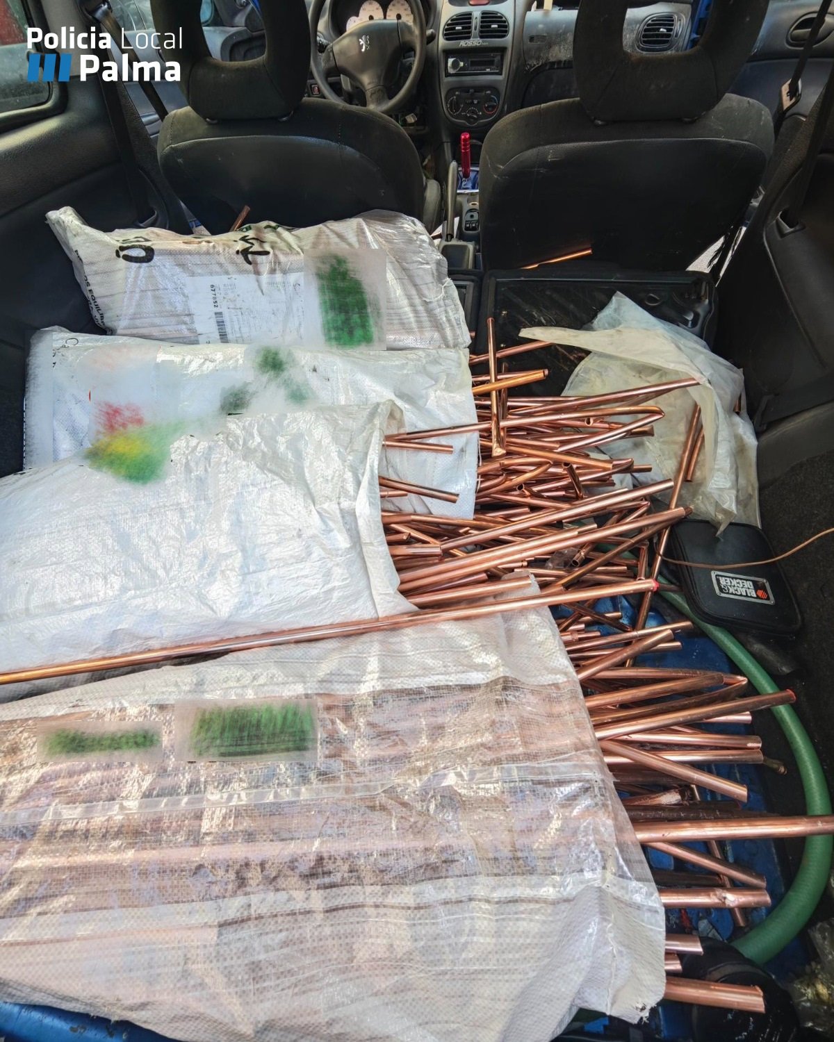 El sospechoso aprovechó el momento para huir a pie. En el registro del coche abandonado, los agentes hallaron una riñonera con el DNI del implicado y cuatro sacos con una gran cantidad de cobre, pasamontañas, patas de cabra y diversas herramientas.