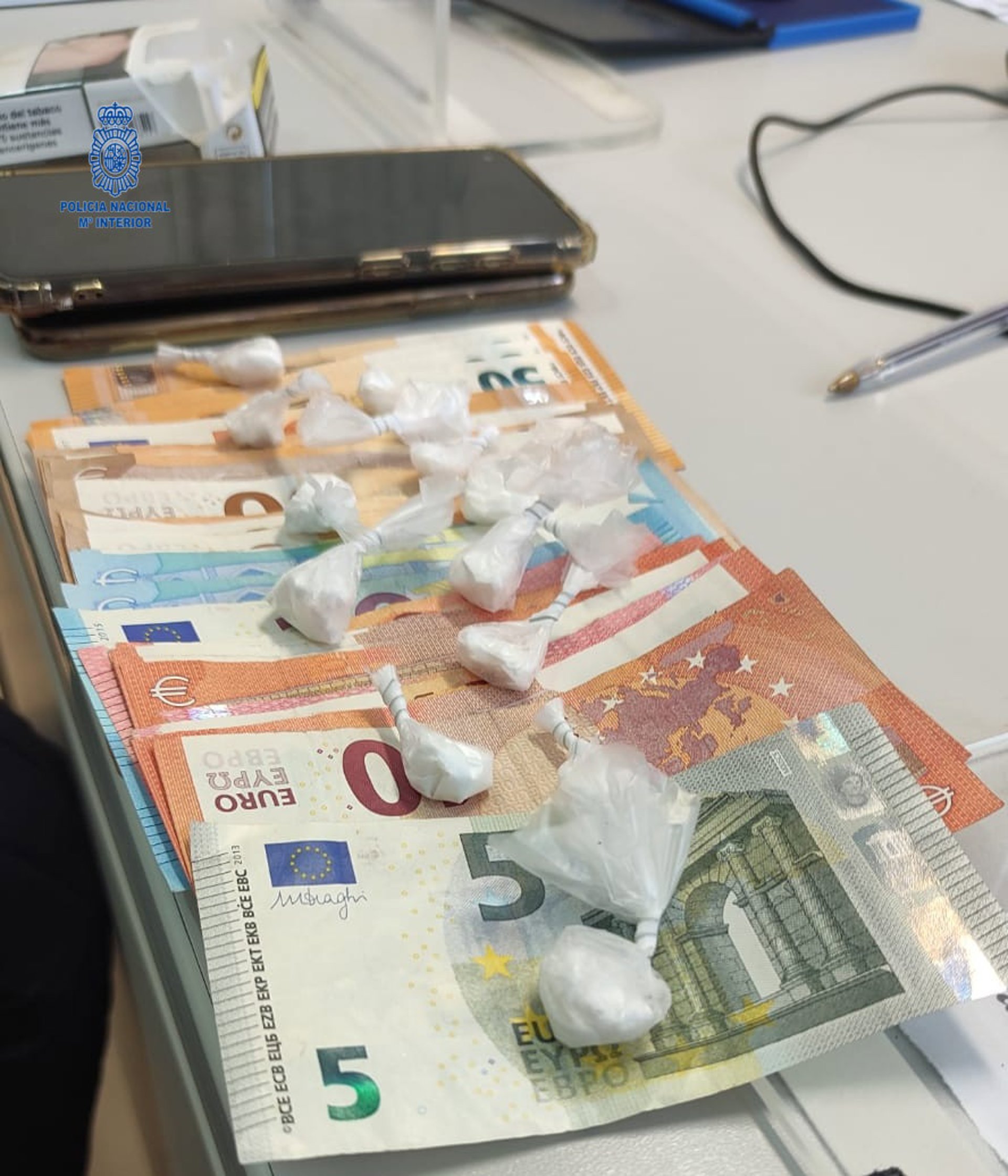 Además los agentes comprobaron como el detenido portaba numerosos billetes fraccionados y dos teléfonos móviles, recibiendo durante la intervención policial llamadas con diferentes números de teléfono.