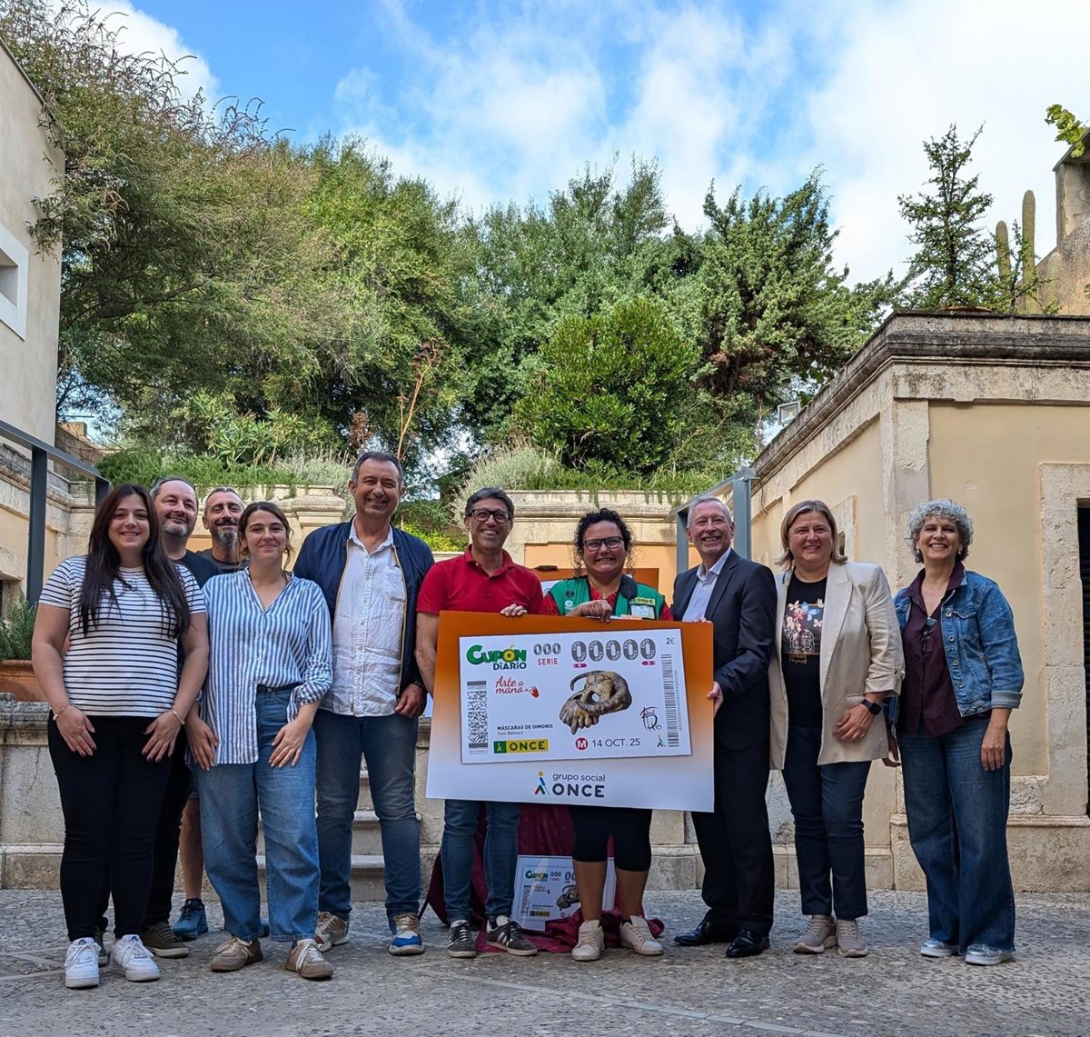 El delegado de la ONCE en Baleares, José Antonio Toledo, el alcalde Campament, Guillem Rosselló, y el presidente de la Federació de dimonis, diables i bèsties de foc de les Illes Balears, Miquel Pons, acompañados de la directora Insular de Patrimonio del Consell de Mallorca, Miquel Pons, han presentado este cupón.
