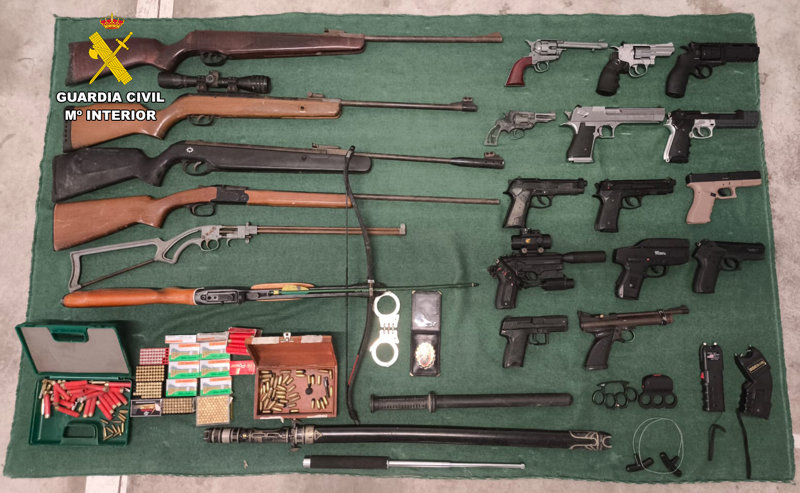 Además se incautaron de dos carabinas y una pistola, 14 armas de aire comprimido, un arma simulada, una pistola detonadora, una ballesta, dos armas de electrochoque, dos llaves de pugilato, varias defensas y 850 cartuchos de diferentes calibres, entre otros objetos. Igualmente se intervinieron 4.850 euro y 43 lámparas para el cultivo de marihuana.